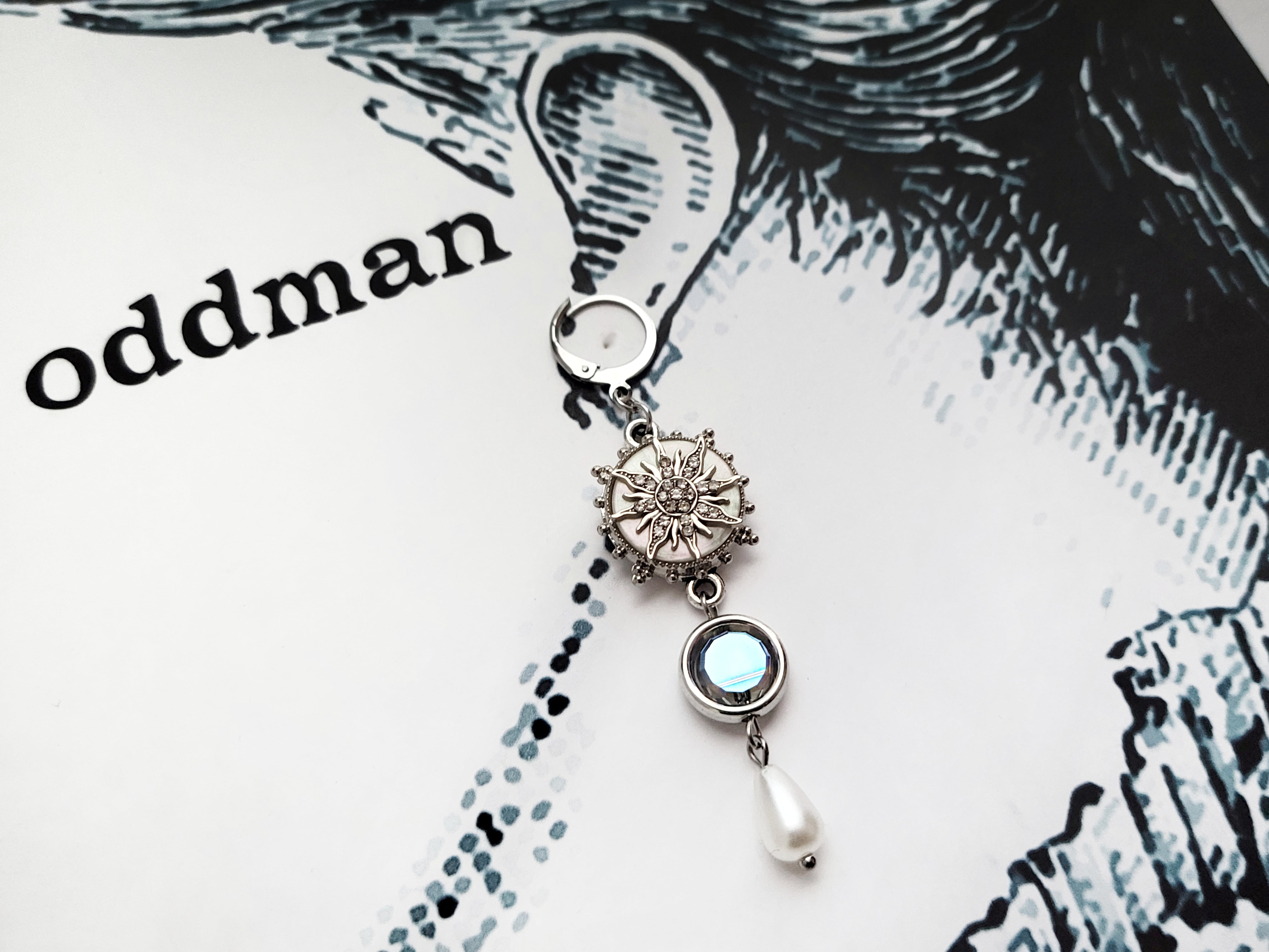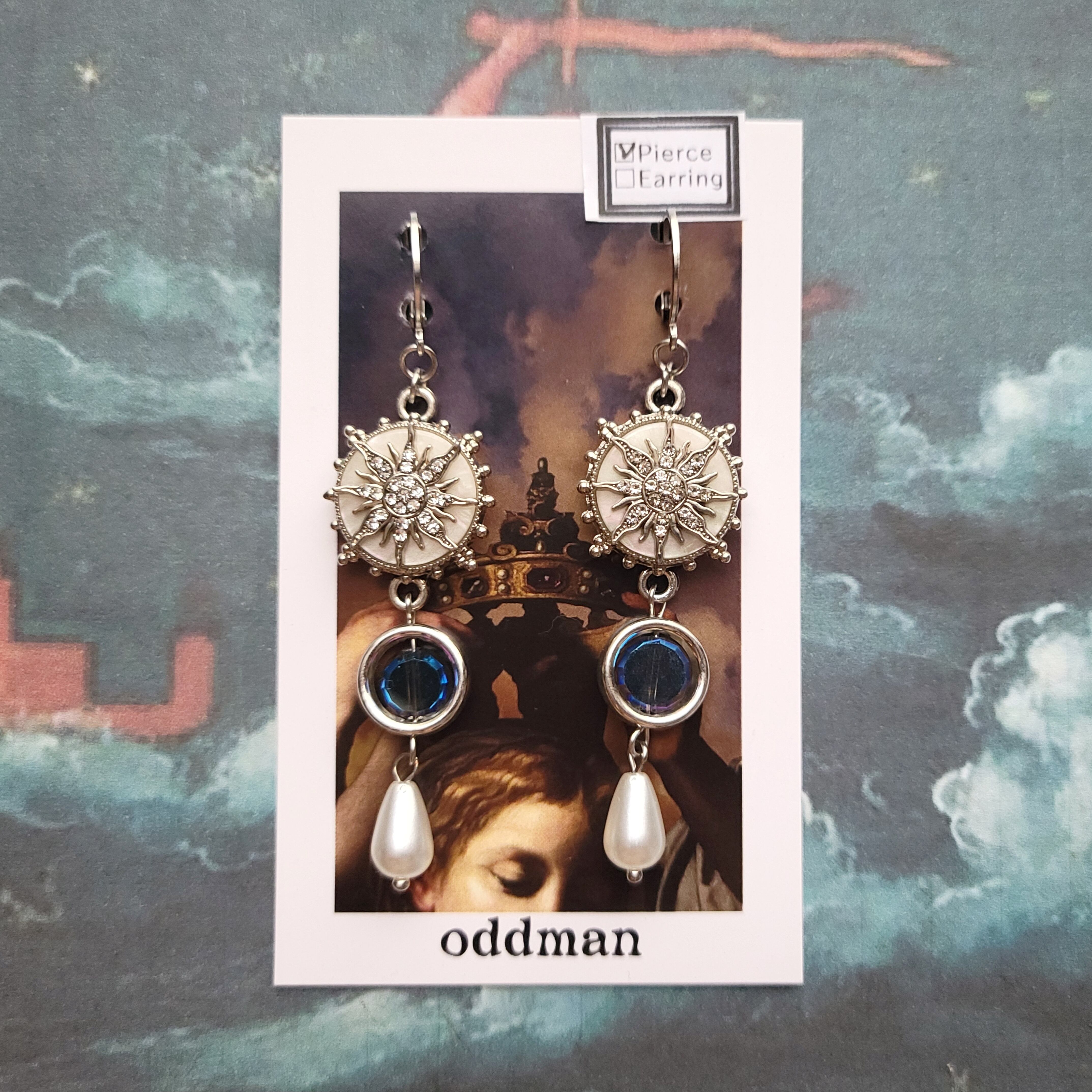 煌めく太陽のモチーフに、青いガラスとパールを添えた耳飾り。