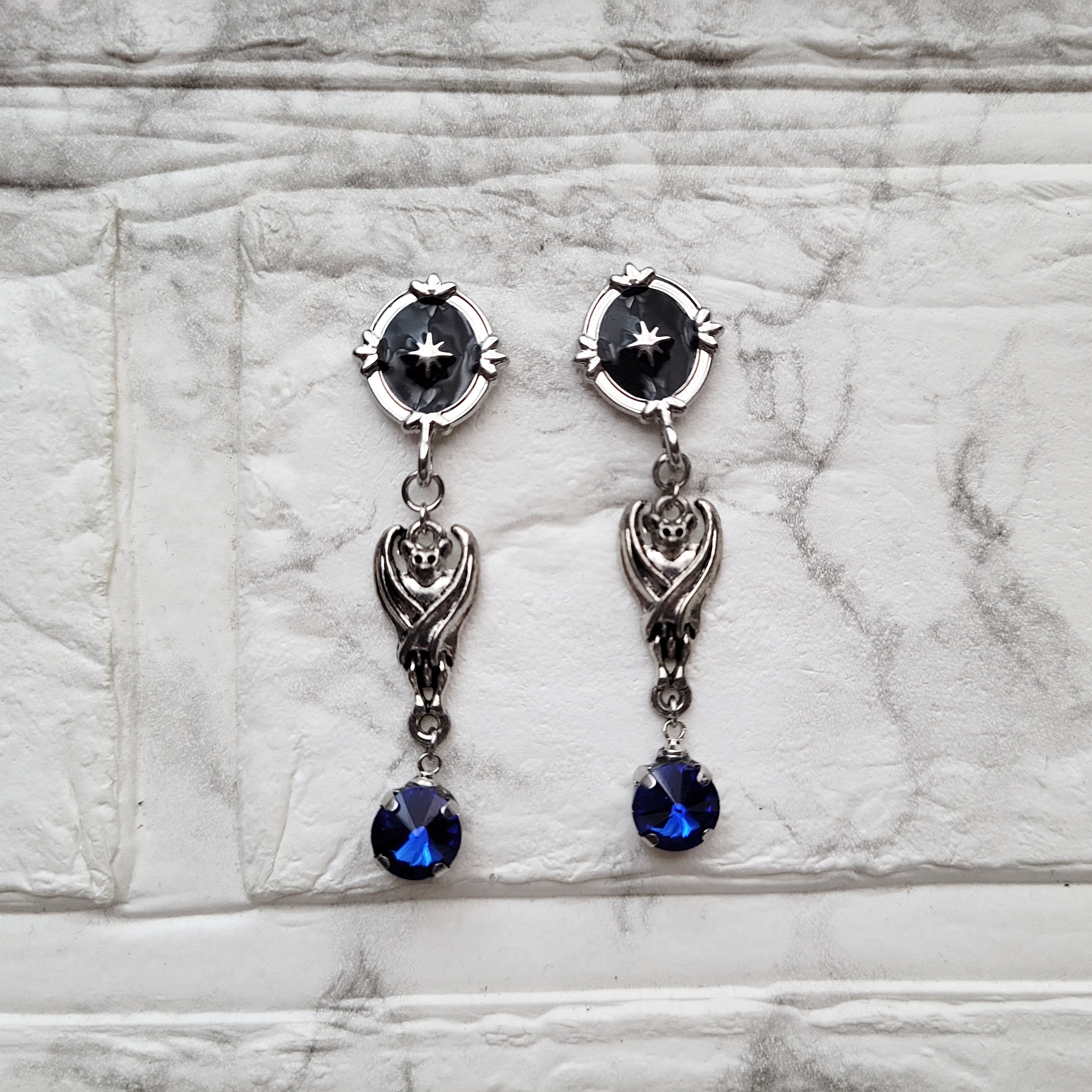 星と青いガラスビジューを添えた、コウモリモチーフの耳飾り。