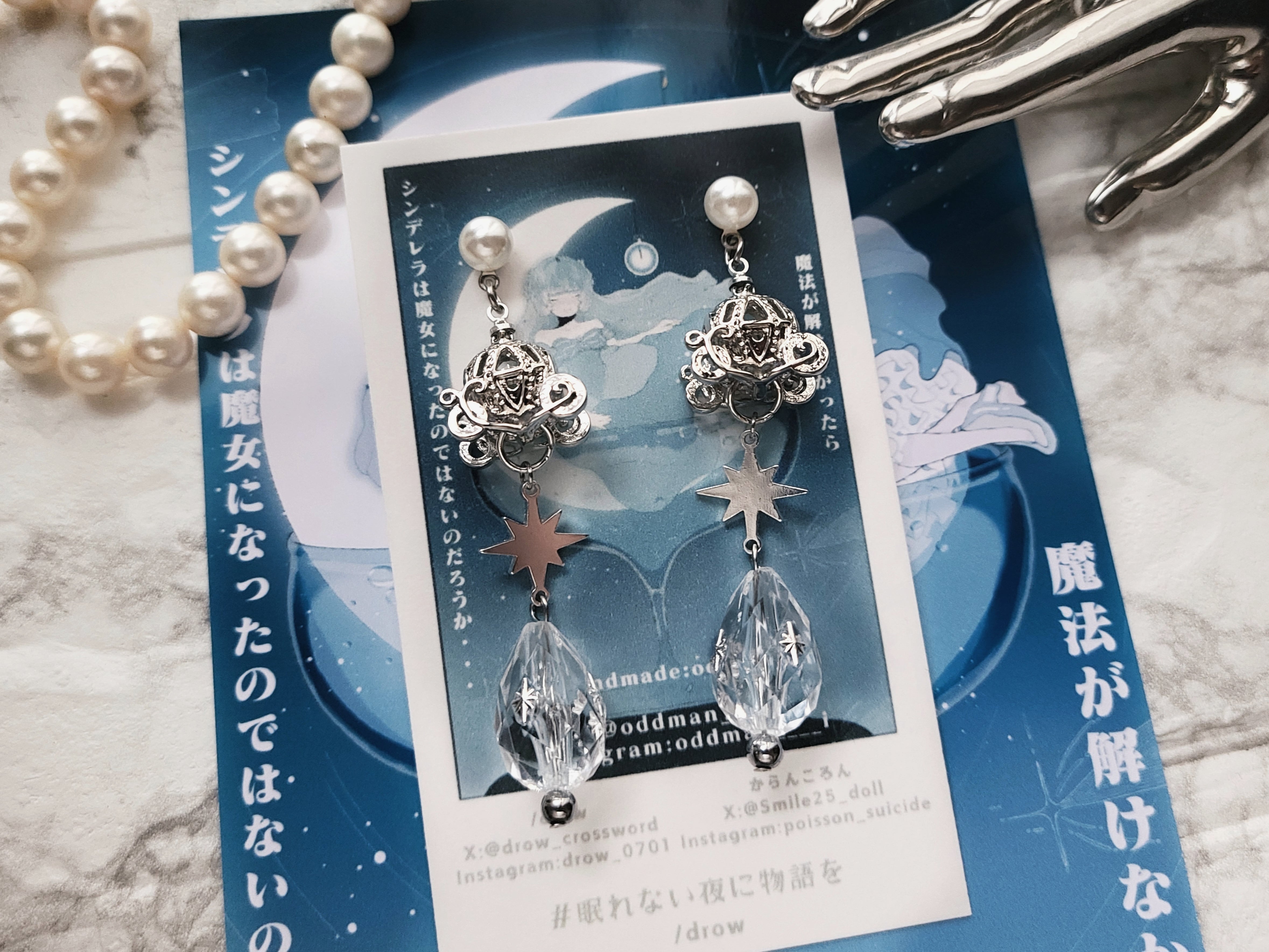 シンデレラをモチーフにした、夜空を走るかぼちゃの馬車の耳飾り。