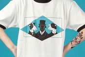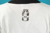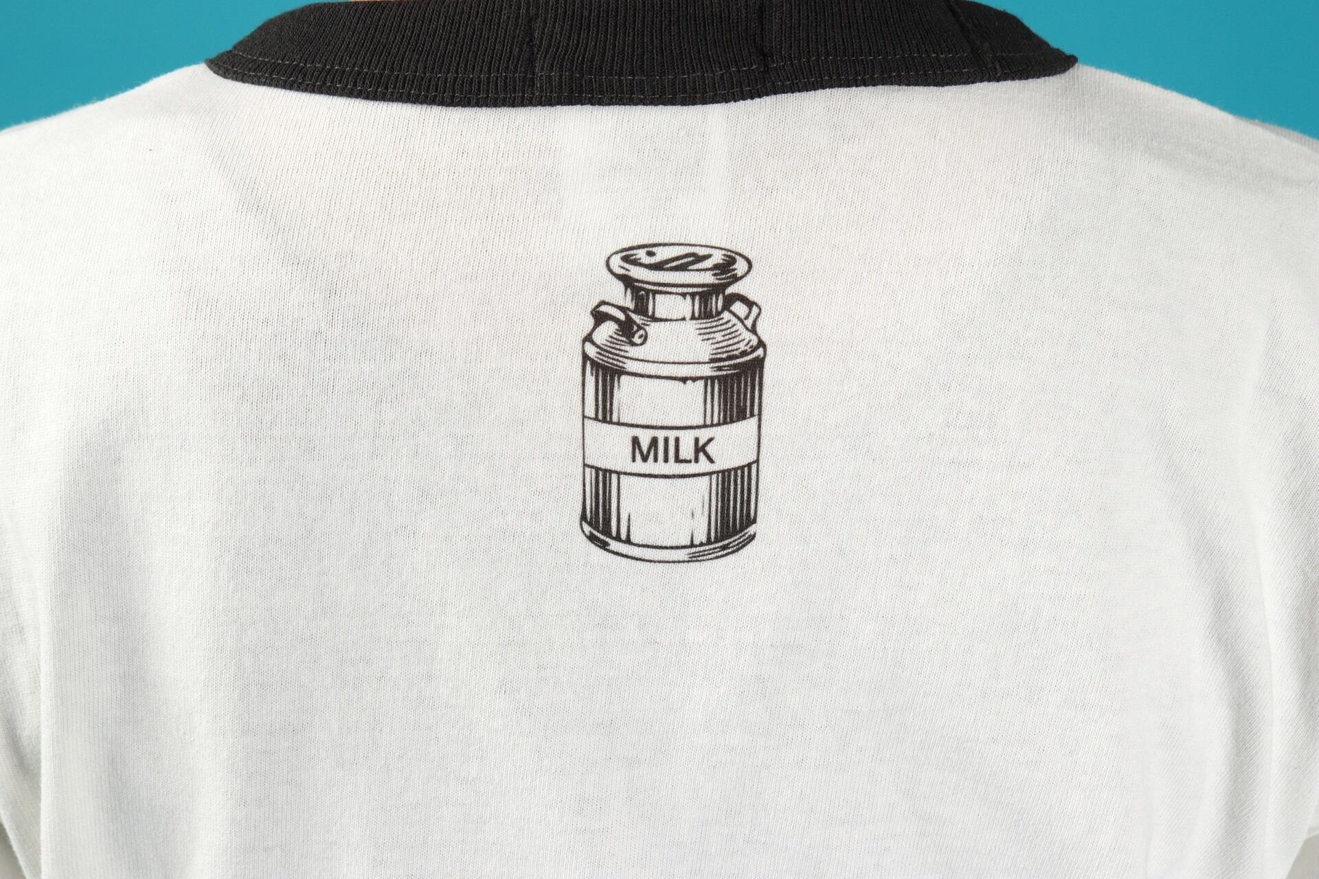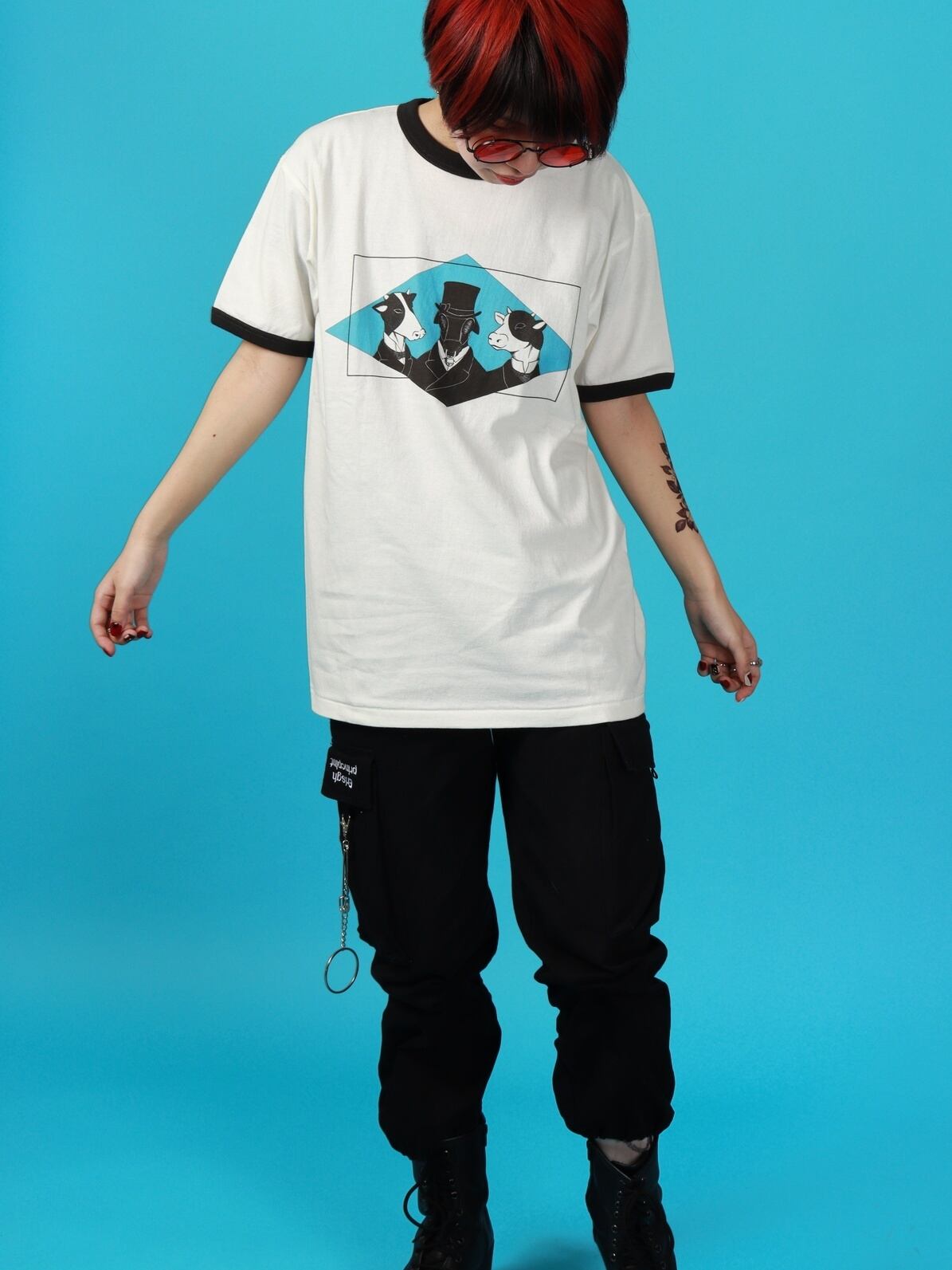 乳牛とガスマスクを被った牛が印刷された、リンガーデザインのTシャツ。